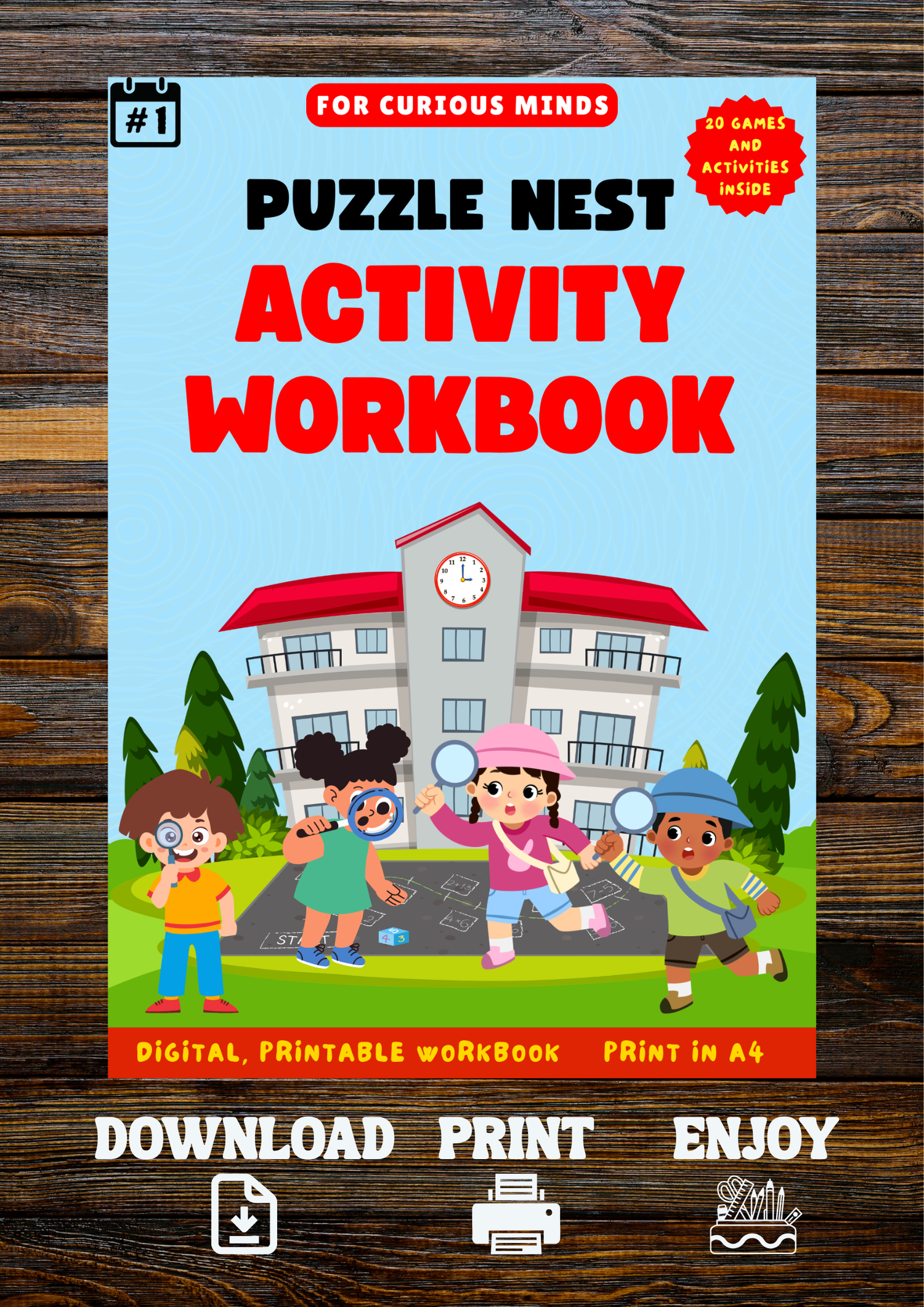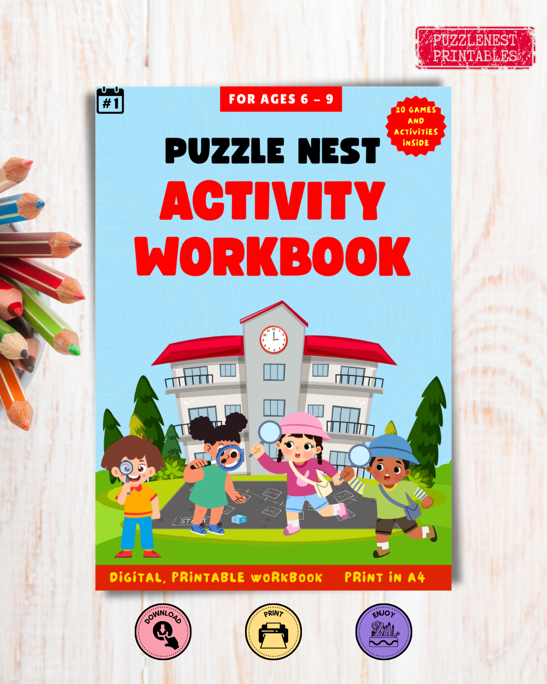Puzzle Nest Activity Workbook – Issue 1 is a printable collection of 20+ visual and logic-based challenges designed for curious kids aged 6–9.